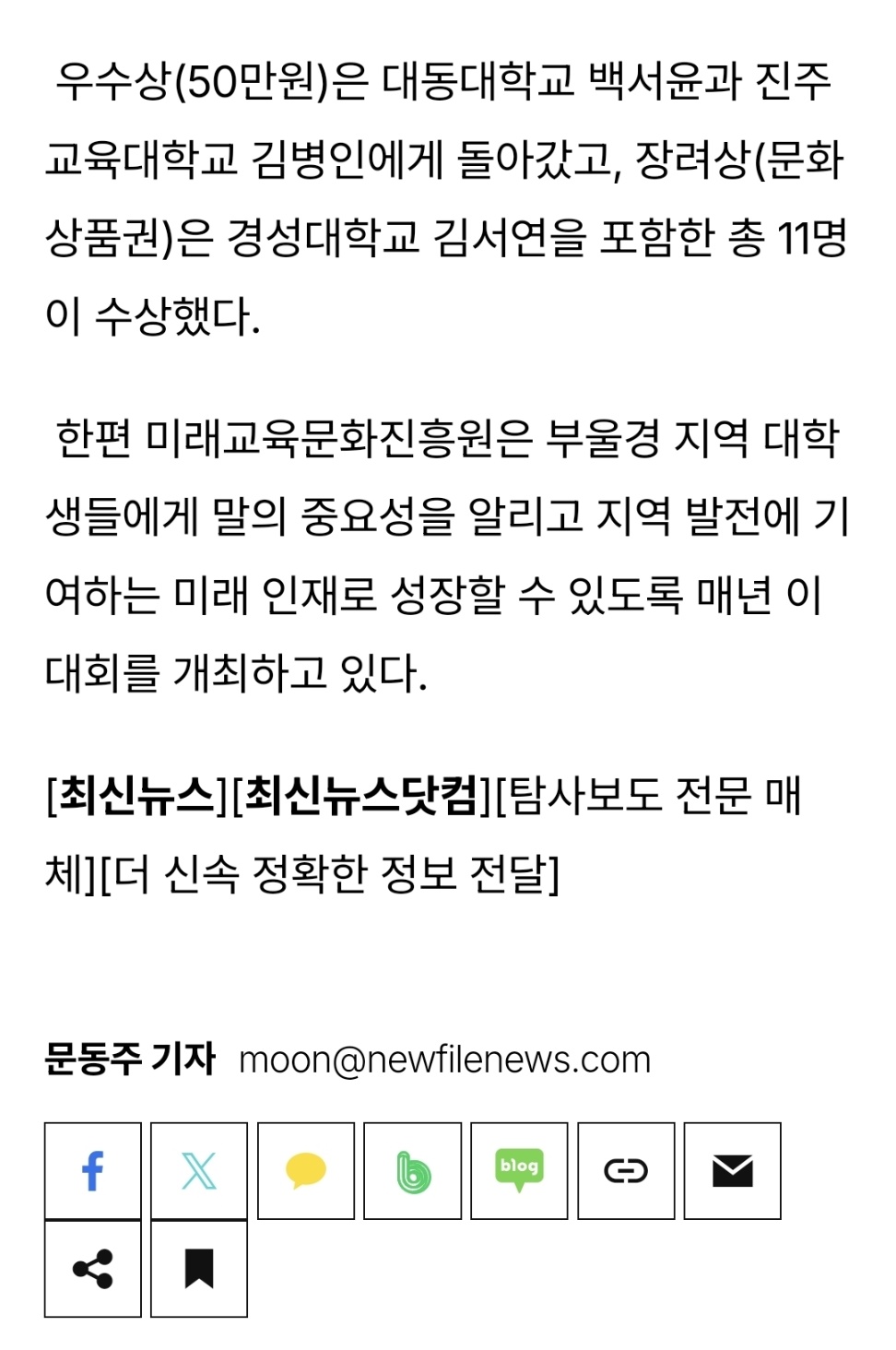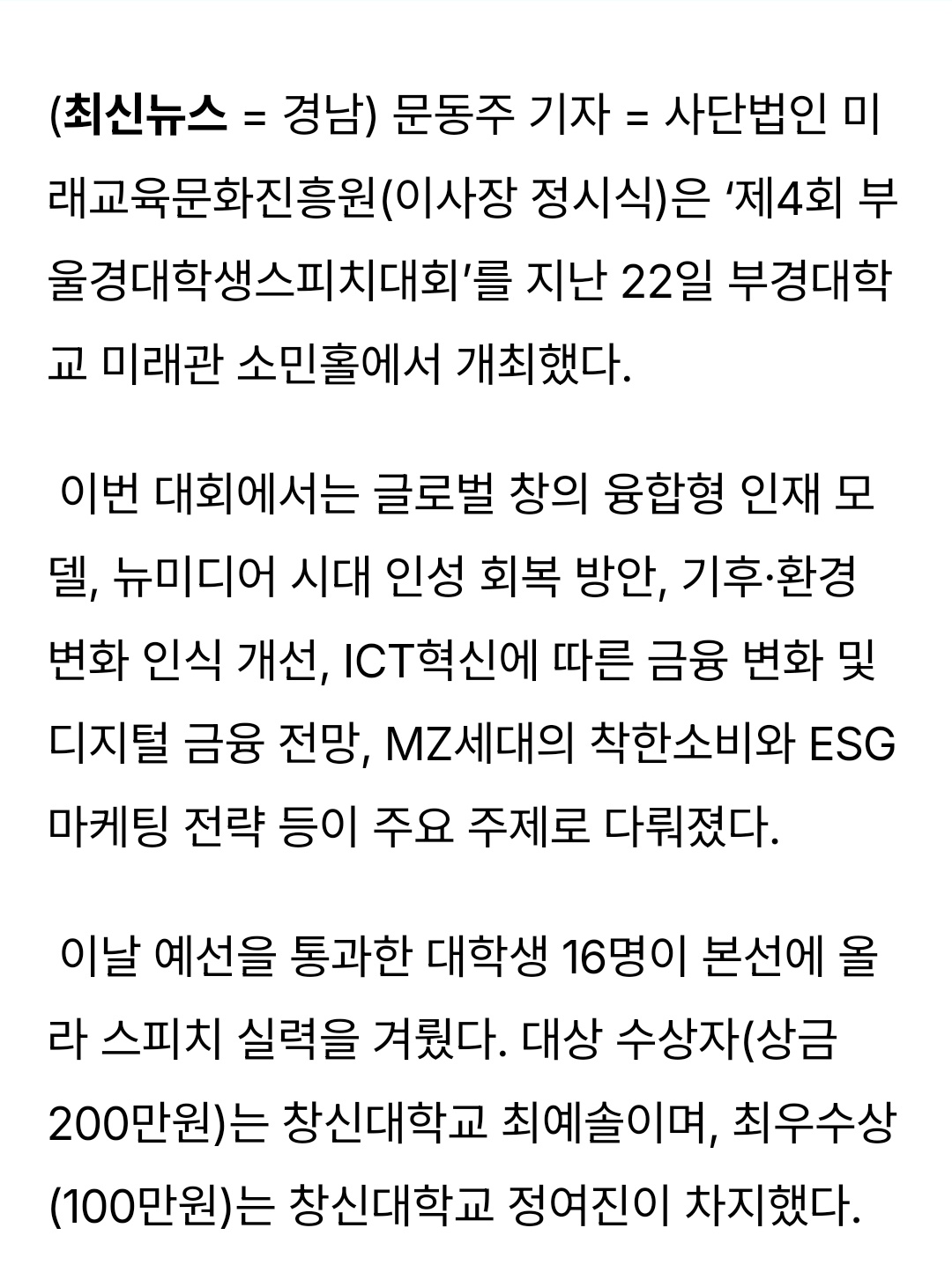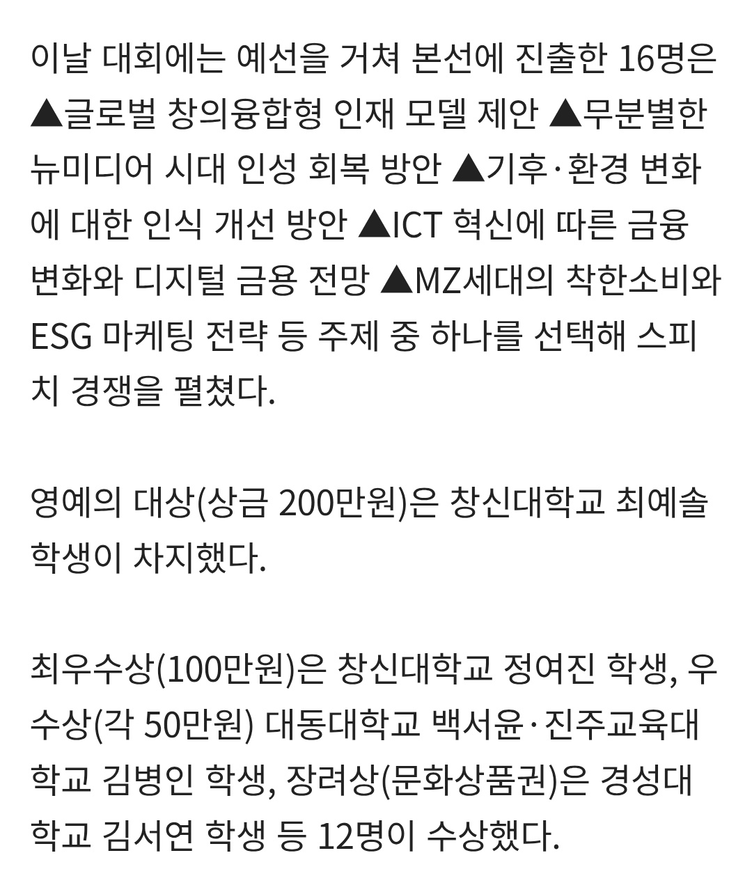 국제신문 보도자료 http://www.kookje.co.kr/news2011/asp/newsbody.asp?code=0300&key=20180813.99099005941 경남도민일보 보도자료 http://www.idomin.com/?mod=news&act=articleView&idxno=573483 경남연합일보 보도자료 http://www.gnynews.co.kr/news/articleView.html?idxno=280390 홈뉴스 보도자료교육 소식 미래교육문화진흥원 청소년 스피치대회 열어 이혜영 기자 lhy@idomin.com 2018년 08월 14일 화요일 (사)미래교육문화진흥원은 11일 창원대 인문홀에서 '제3회 경상남도 청소년 스피치대회'를 열었다. 본선에 진출한 청소년 50여 명이 스피치 실력을 발휘한 결과 정해경(유목초)·조제현(대청중)·김혜진(의령여고) 학생이 경남도교육감상을 받았다. UPDATE : 2018.8.17 금 14:25 기사검색 전체기사 정치 경제 사회 문화 엔터테인먼트 스포츠 이슈 동영상 전체기사 동정 칼럼 데스크 칼럼 독자의소리 기자수첩 기고 오피니언일반 전체기사 기획특집 일반 전체기사 시선집중토론방 독자투고 기사제보 자유게시판 보도자료 미래교문진흥원, 청소년 스피치대회 ‘성료’ 청소년 50여 명 선의의 경쟁승인2018.08.13 크게 작게 메일 인쇄 신고 ▲ (사)미래교육문화진흥원은 지난 11일 창원대서 ‘제3회 경남도 청소년 스피치대회’를 개최했다. 사단법인 미래교육문화진흥원(원장 정시식)은 바른인성함양과 창의융합인재개발을 위한 ‘제3회 경남도 청소년 스피치대회’를 지난 11일 창원대학교 인문대학 인문홀에서 개최했다고 13일 밝혔다. 예선을 거쳐 본선에 진출한 경남의 청소년 50여 명이 각자의 스피치 실력을 발휘해 선의의 경쟁을 펼쳤다. 정해경(유목초)·조제현(대청중)·김혜진(의령여고) 학생이 경남도교육감상을, 문재령(유어초)·조원준(해운중)·김서현(의령여고) 학생이 창원대학교총장상을, 주승호(가고파초)·이서영(삼현여중)·맹현환(함양고) 학생이 경상남도지방경찰청장상을, 권혜진(유어초)·이서영(삼현여중) 학생이 경남교총회장상을, 하지수(사남초)·신서현(대청중)·최주은(의령여고) 학생이 창신대학교총장상을, 김성란(경운초)·허유나(삼현여중)·강혜윤(칠원고) 학생이 한국폴리텍7대학장상을, 이유승(가고파초)·서무경(삼천포제일중) 학생이 좋은데이나눔재단이사장상을, 임채민(삼문초)·유아령(진명여중) 학생이 미래교육문화진흥원장상을 수상했다. 한편, 사단법인 미래교육문화진흥원은 말의 소중함을 일깨우기 위해 이 대회를 매년 개최하고 있다. /문병용기자 moon@gnynews.co.kr <저작권자 © 경남연합일보, 무단 전재 및 재배포 금지> 제3회 경남도 청소년 스피치 대회 열려 (사)미래교육문화진흥원(원장 정시식)은 지난 11일 창원대학교 인문대학 인문홀에서 바른 인성함양과 창의융합인재 개발을 위한 ‘제3회 경상남도청소년스피치대회’를 개최했다고 13일 밝혔다.예선을 거쳐 본선에 진출한 경남의 청소년 50여 명은 각자의 스피치 실력을 발휘하며 선의의 경쟁을 펼쳤다.이날 대회에서 ▶경남도교육감상은 정해경(유목초), 조제현(대청중),김혜진(의령여고) 학생 ▶창원대학교 총장상은 문재령(유어초), 조원준(해운중), 김서현(의령여고) 학생 ▶경남지방경찰청장상은 주승호(가고파초), 이서영(삼현여중), 맹현환(함양고) 학생이 각각 수상했다.또 ▶경남교총회장상은 권혜진(유어초), 이서영(삼현여중) 학생 ▶창신대학교총장상은 하지수(사남초), 신서현(대청중), 최주은(의령여고) 학생 ▶한국폴리텍7대학장상은 김성란(경운초), 허유나(삼현여중), 강혜윤(칠원고) 학생 ▶좋은데이나눔재단이사장상은 유승(가고파초),서무경(삼천포제일중) 학생 ▶미래교육문화진흥원장상은 임채민(삼문초), 유아령(진명여중) 학생이 각각 수상했다.정시식 원장은 “말의 소중함을 일깨우기 위해 매년 대회를 개최하고 있다. 해를 거듭할수록 참가 학생들의 수준이 높아지고 있는 것을 느낀다”며 “내년에는 더 좋은 대회가 될 수 있도록 노력하겠다”고 말했다.이종호 기자 jhlee@kookje.co.kr 11일 창원대학교 인문대학 인문홀에서 열린 ‘제3회 경상남도청소년스피치대회’에 참가한 수상자들이 함께 기념촬영을 했다. 미래교육문화진흥원 제공