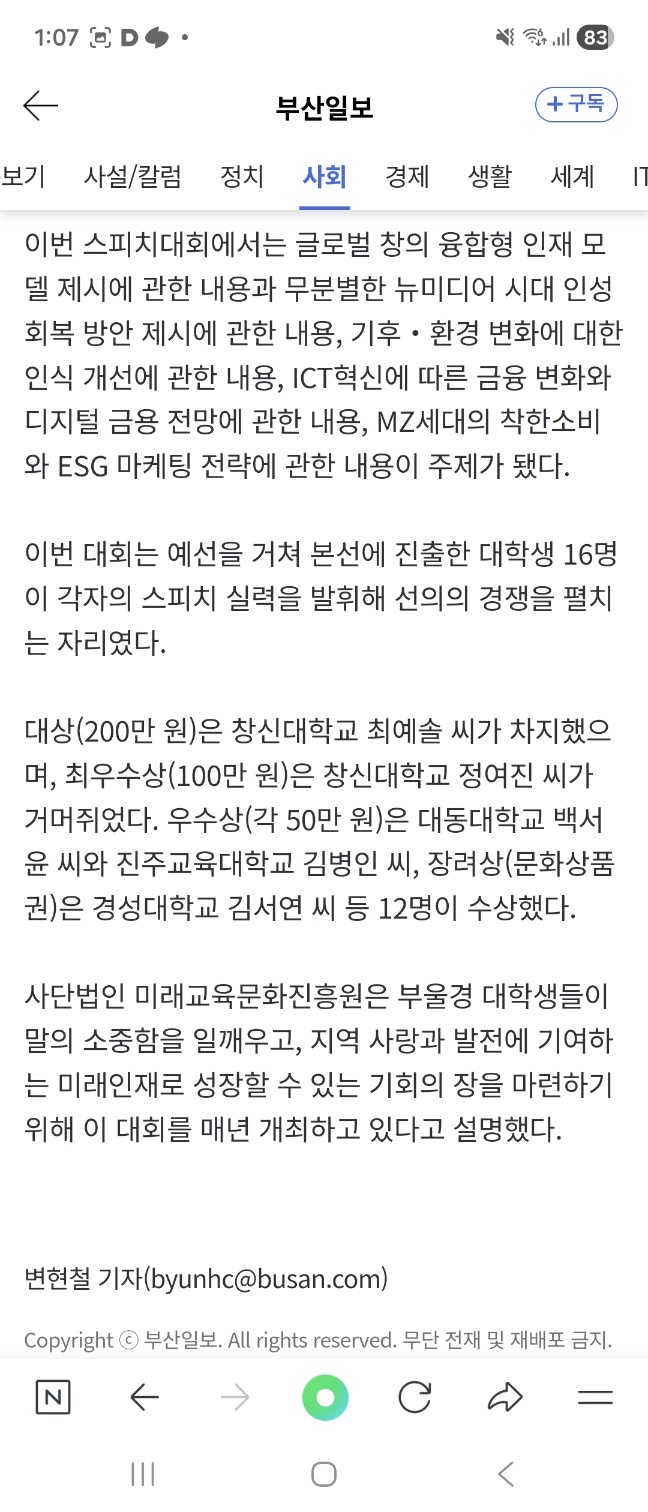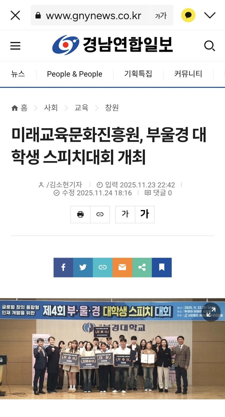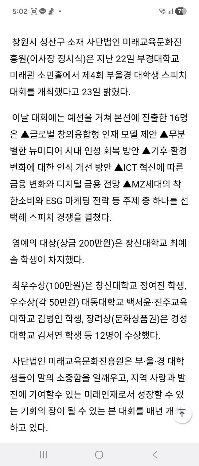 국제신문 보도자료 http://www.kookje.co.kr/news2011/asp/newsbody.asp?code=0300&key=20180813.99099005941 경남도민일보 보도자료 http://www.idomin.com/?mod=news&act=articleView&idxno=573483 경남연합일보 보도자료 http://www.gnynews.co.kr/news/articleView.html?idxno=280390 홈뉴스 보도자료교육 소식 미래교육문화진흥원 청소년 스피치대회 열어 이혜영 기자 lhy@idomin.com 2018년 08월 14일 화요일 (사)미래교육문화진흥원은 11일 창원대 인문홀에서 '제3회 경상남도 청소년 스피치대회'를 열었다. 본선에 진출한 청소년 50여 명이 스피치 실력을 발휘한 결과 정해경(유목초)·조제현(대청중)·김혜진(의령여고) 학생이 경남도교육감상을 받았다. UPDATE : 2018.8.17 금 14:25 기사검색 전체기사 정치 경제 사회 문화 엔터테인먼트 스포츠 이슈 동영상 전체기사 동정 칼럼 데스크 칼럼 독자의소리 기자수첩 기고 오피니언일반 전체기사 기획특집 일반 전체기사 시선집중토론방 독자투고 기사제보 자유게시판 보도자료 미래교문진흥원, 청소년 스피치대회 ‘성료’ 청소년 50여 명 선의의 경쟁승인2018.08.13 크게 작게 메일 인쇄 신고 ▲ (사)미래교육문화진흥원은 지난 11일 창원대서 ‘제3회 경남도 청소년 스피치대회’를 개최했다. 사단법인 미래교육문화진흥원(원장 정시식)은 바른인성함양과 창의융합인재개발을 위한 ‘제3회 경남도 청소년 스피치대회’를 지난 11일 창원대학교 인문대학 인문홀에서 개최했다고 13일 밝혔다. 예선을 거쳐 본선에 진출한 경남의 청소년 50여 명이 각자의 스피치 실력을 발휘해 선의의 경쟁을 펼쳤다. 정해경(유목초)·조제현(대청중)·김혜진(의령여고) 학생이 경남도교육감상을, 문재령(유어초)·조원준(해운중)·김서현(의령여고) 학생이 창원대학교총장상을, 주승호(가고파초)·이서영(삼현여중)·맹현환(함양고) 학생이 경상남도지방경찰청장상을, 권혜진(유어초)·이서영(삼현여중) 학생이 경남교총회장상을, 하지수(사남초)·신서현(대청중)·최주은(의령여고) 학생이 창신대학교총장상을, 김성란(경운초)·허유나(삼현여중)·강혜윤(칠원고) 학생이 한국폴리텍7대학장상을, 이유승(가고파초)·서무경(삼천포제일중) 학생이 좋은데이나눔재단이사장상을, 임채민(삼문초)·유아령(진명여중) 학생이 미래교육문화진흥원장상을 수상했다. 한편, 사단법인 미래교육문화진흥원은 말의 소중함을 일깨우기 위해 이 대회를 매년 개최하고 있다. /문병용기자 moon@gnynews.co.kr <저작권자 © 경남연합일보, 무단 전재 및 재배포 금지> 제3회 경남도 청소년 스피치 대회 열려 (사)미래교육문화진흥원(원장 정시식)은 지난 11일 창원대학교 인문대학 인문홀에서 바른 인성함양과 창의융합인재 개발을 위한 ‘제3회 경상남도청소년스피치대회’를 개최했다고 13일 밝혔다.예선을 거쳐 본선에 진출한 경남의 청소년 50여 명은 각자의 스피치 실력을 발휘하며 선의의 경쟁을 펼쳤다.이날 대회에서 ▶경남도교육감상은 정해경(유목초), 조제현(대청중),김혜진(의령여고) 학생 ▶창원대학교 총장상은 문재령(유어초), 조원준(해운중), 김서현(의령여고) 학생 ▶경남지방경찰청장상은 주승호(가고파초), 이서영(삼현여중), 맹현환(함양고) 학생이 각각 수상했다.또 ▶경남교총회장상은 권혜진(유어초), 이서영(삼현여중) 학생 ▶창신대학교총장상은 하지수(사남초), 신서현(대청중), 최주은(의령여고) 학생 ▶한국폴리텍7대학장상은 김성란(경운초), 허유나(삼현여중), 강혜윤(칠원고) 학생 ▶좋은데이나눔재단이사장상은 유승(가고파초),서무경(삼천포제일중) 학생 ▶미래교육문화진흥원장상은 임채민(삼문초), 유아령(진명여중) 학생이 각각 수상했다.정시식 원장은 “말의 소중함을 일깨우기 위해 매년 대회를 개최하고 있다. 해를 거듭할수록 참가 학생들의 수준이 높아지고 있는 것을 느낀다”며 “내년에는 더 좋은 대회가 될 수 있도록 노력하겠다”고 말했다.이종호 기자 jhlee@kookje.co.kr 11일 창원대학교 인문대학 인문홀에서 열린 ‘제3회 경상남도청소년스피치대회’에 참가한 수상자들이 함께 기념촬영을 했다. 미래교육문화진흥원 제공